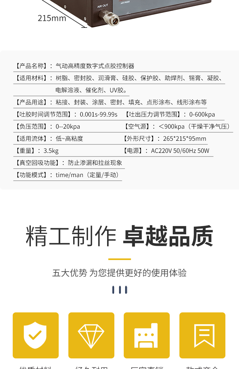 不管您是從事水性液體或濃稠膏狀流體的點膠作業(yè),本控制器都可以大幅度降低您的作業(yè)成本,提高您的產(chǎn)品品質(zhì)、效率以及減少您的流體用量,廣泛應(yīng)用于電子、光學、包裝、汽車、醫(yī)療、飾品、玩具等領(lǐng)域。