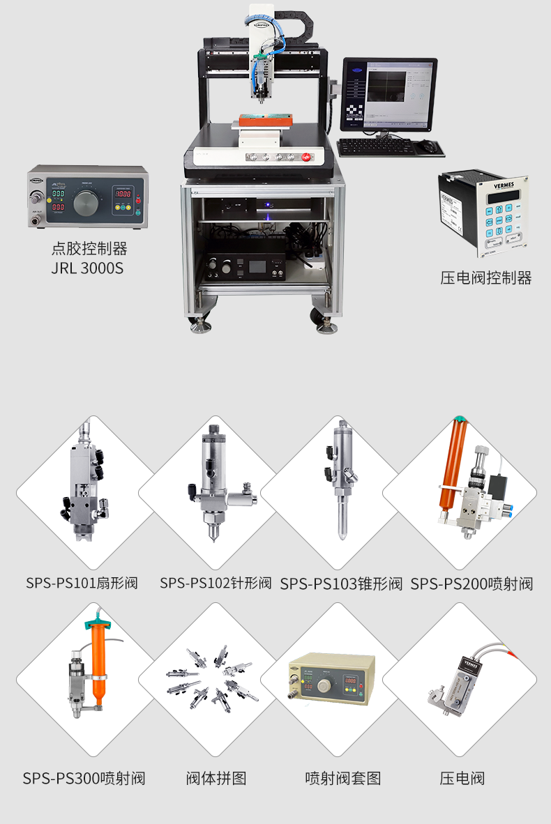 SPS-PS300是一款非接觸式噴射點膠閥,可廣泛應用于表面貼裝膠、導電銀漿、IC封裝膠、底部填充膠、密封膠、表面涂敷膠等各類膠粘劑的可控流量、高速點膠作業。既能射入小到百微米的狹窄空間,也能在指定位置完成重量到0.01毫克級別的精準點膠。
